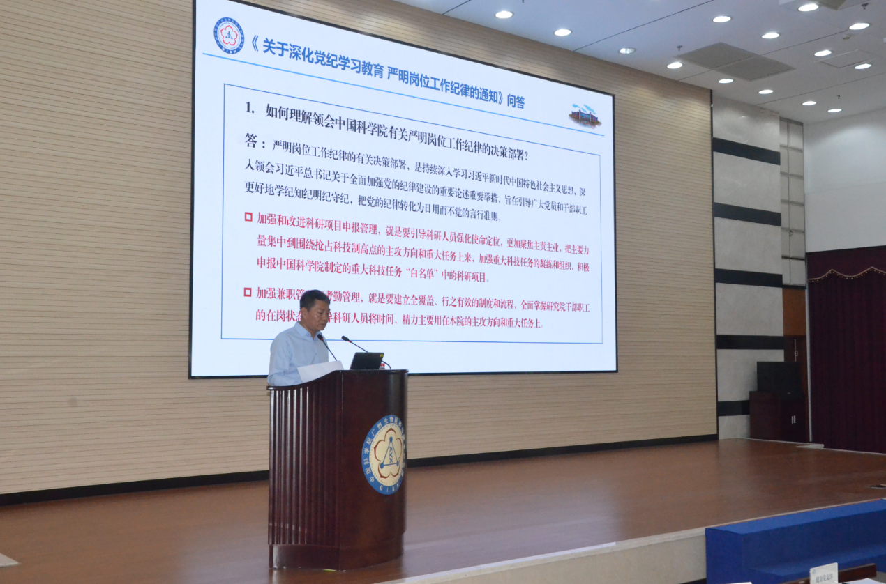 會上,張鴻翔詳細傳達并解讀了中國科學院《關于深化黨紀學習教育嚴明崗位工作紀律通知》和《關于推進黨紀學習教育常態化長效化的通知》的新精神和新要求,并對院里關于開展“深化黨紀學習教育嚴明崗位工作紀律”專項工作的決策部署、具體要求和研究院的落實情況進行了全面深入的介紹和闡述。