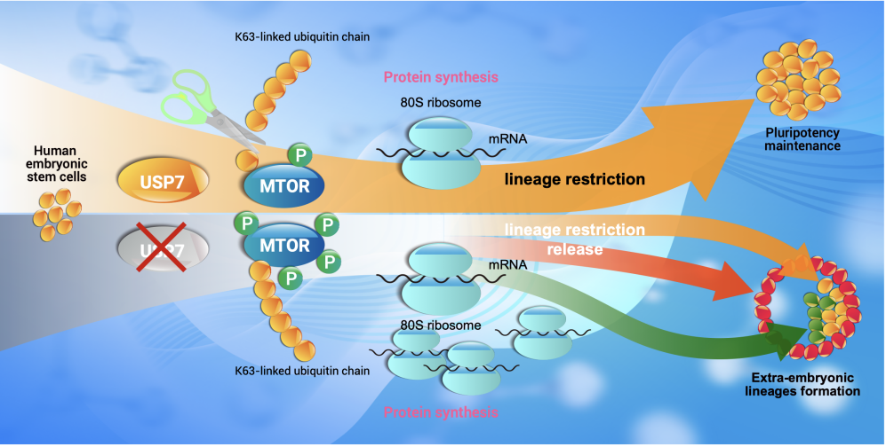 近期,中國科學院廣州生物醫藥與健康研究院發表了題為“USP7 restricts lineage potency in human embryonic stem cells through modulating mTOR activity”的研究論文。該研究揭示了一種限制人多能干細胞發育潛能的關鍵因子——去泛素化酶USP7,并闡釋其通過去除mTOR 蛋白上非經典K63多泛素化修飾,從而調控 mTOR 活性的全新機制。