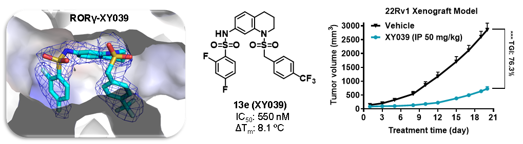 前列腺癌(Prostate cancer,PCa)是男性發(fā)病率和致死率都極高的惡性腫瘤,雄激素受體(Androgen receptor,AR)信號通路在前列腺癌的發(fā)生發(fā)展中扮演著重要的角色。AR基因擴增、突變和剪切體表達等使得前列腺癌治療面臨耐藥難題。如何開發(fā)新靶點并發(fā)展候選藥物克服臨床耐藥是該領(lǐng)域亟需解決的關(guān)鍵問題。本課題組前期研究發(fā)現(xiàn)(Nature Medicine,2016)核受體RORγ是調(diào)控AR表達的關(guān)鍵驅(qū)動因子,可作為前列腺癌治療新靶標(biāo),靶向RORγ可為臨床耐藥治療提供新的策略。