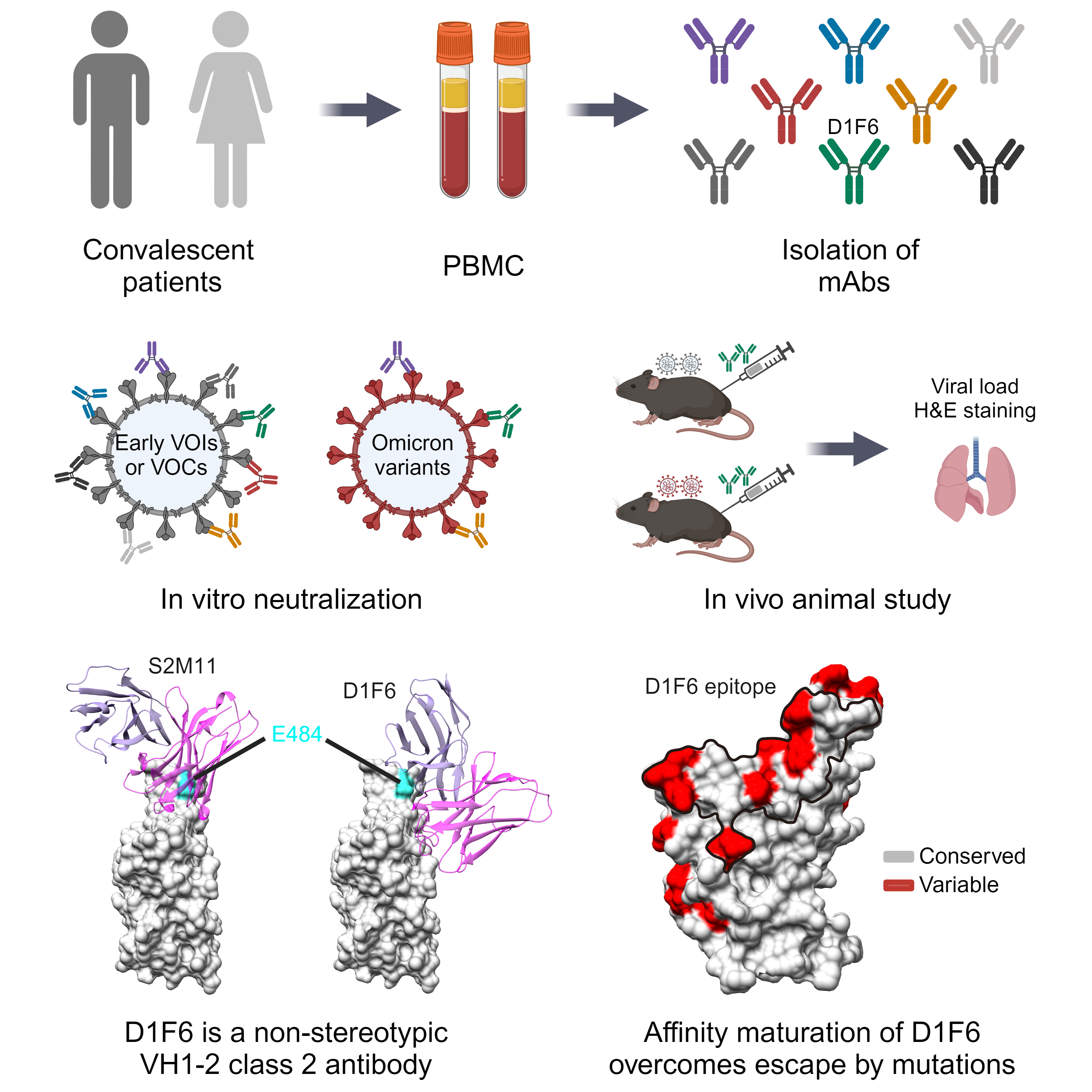 面對自然感染和疫苗接種產生的免疫壓力,新冠病毒持續進化和變異,逃逸了絕大部分早期篩選獲得的中和抗體。其中,在人群中被廣泛誘導的VH1-2基因編碼抗體被認為在新冠病毒早期的抗體免疫中起到了關鍵作用,但由于新冠病毒刺突蛋白E484K/A的突變,大多數VH1-2類抗體被逃逸。在該研究中,研究人員從早期新冠病毒野生株感染者中篩選到一株由VH1-2基因編碼的中和抗體D1F6。不同于其他已知的VH1-2抗體,D1F6不被攜帶E484A突變的Omicron變異株逃逸,對Omicron變異株的多種亞型仍保持高效中和活性。動物實驗結果表明D1F6可以有效抑制Delta和Omicron?BA.5、XBB.1.5、EG.5.1等變異株在小鼠體內的復制。