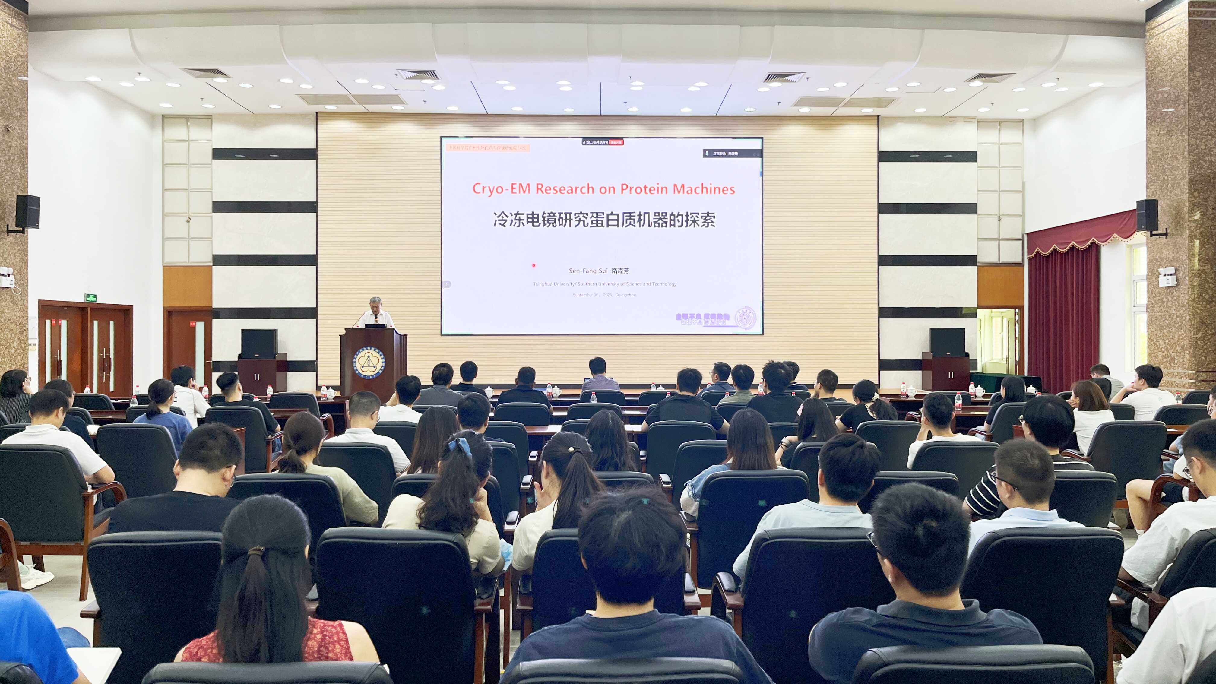 隋森芳院士以《冷凍電鏡研究蛋白質機器的探索》為題作報告。他結合自身數十年科研經歷,分享了幾點科研體會:選擇處于上升階段的學科、找準合適切入點并秉持堅持不懈的精神,為科研筑牢根基;持續跟進前沿,動態更新課題方向,助力在領域內實現突破。報告中,隋院士還系統解讀冷凍電鏡技術的核心價值,重點介紹單顆粒技術與冷凍電子斷層成像技術兩大核心技術,詳解其團隊創新性融合兩種技術,成功實現細胞切片中原位蛋白近原子分辨率解析,破解傳統技術“純化結構”與“原位功能”割裂問題的研究過程。同時,分享團隊在光合作用系統研究中的系列成果,尤其在“藻單體”研究中,借助冷凍電鏡揭示能量傳遞機制,發現骨架蛋白空間結構與色素分子微環境對能量傳遞方向的關鍵調控作用,為理解光合作用高效能量轉化原理提供直接結構證據。報告結束后,與會人員還圍繞科研方向選擇、冷凍電鏡樣品制備、學生培養等展開交流。