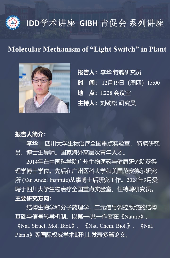 2024年12月19日IDD學術講座&GIBH青促會系列講座:Molecular Mechanism of “Light Switch” in Plant