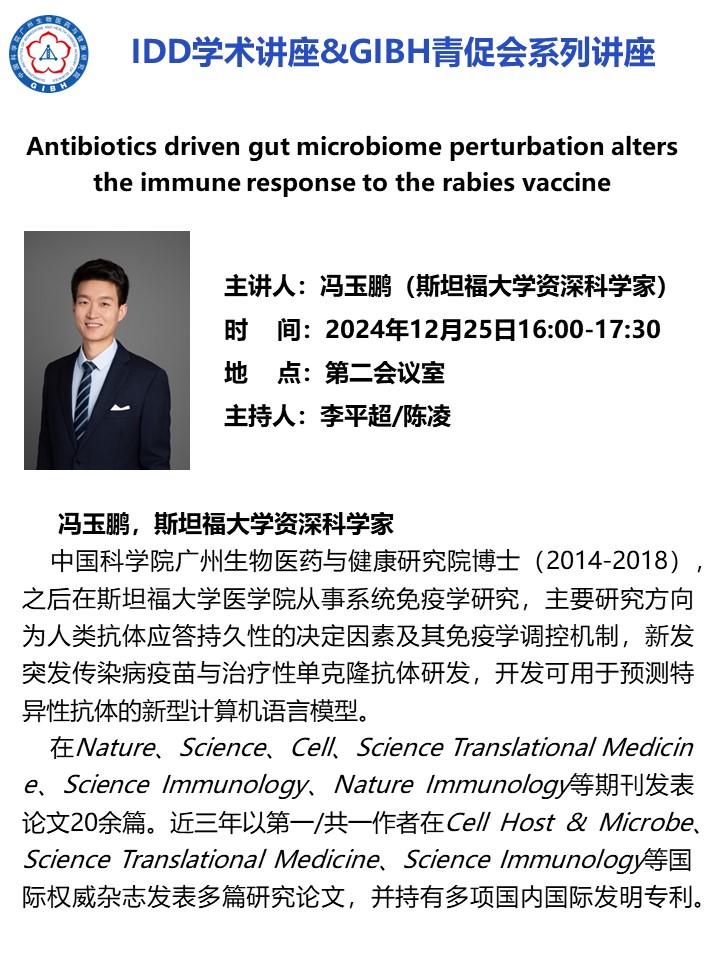 2024年12月25日IDD學術講座&GIBH青促會系列講座:Antibiotics driven gut microbiome perturbation alters the immune response to the rabies vaccine