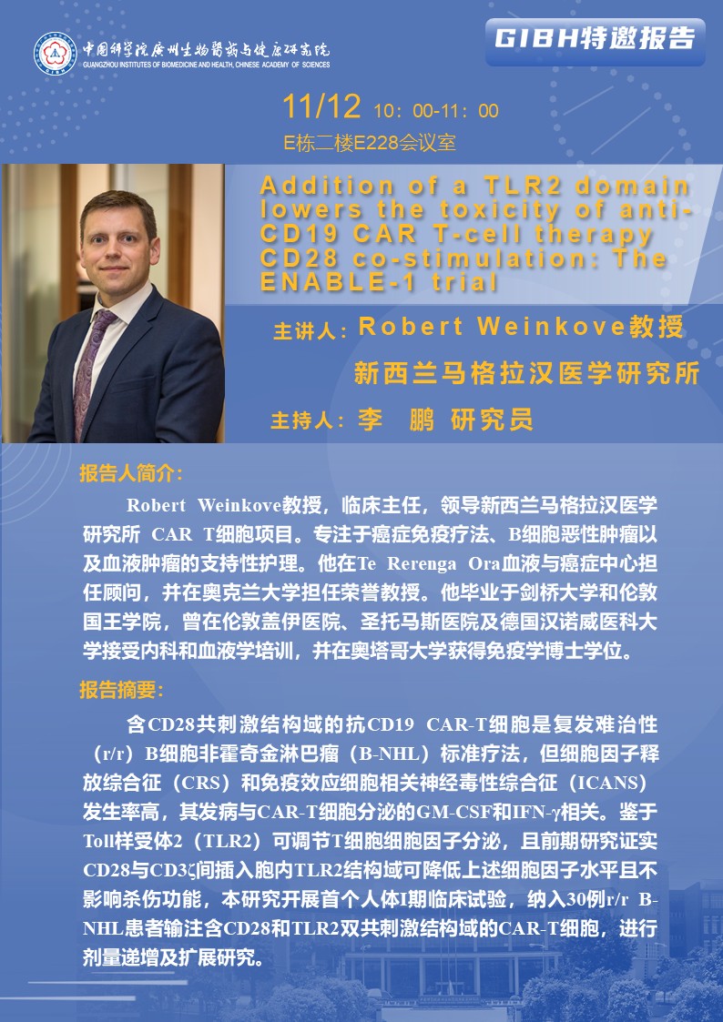 2025年11月12日特邀報告:Addition of a TLR2 domain lowers the toxicity of anti-CD19 CAR T-cell therapy CD28 co-stimulation: The ENABLE-1 trial