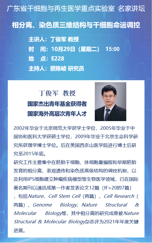 2024年10月29日廣東省干細胞與再生醫學重點實驗室名家講壇:相分離、染色質三維結構與干細胞命運調控
