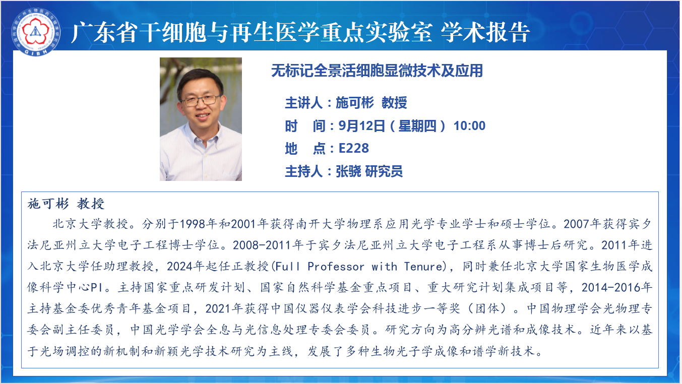 2024年9月12日廣東省干細胞與再生醫學重點實驗室學術報告:無標記全景活細胞顯微技術及應用