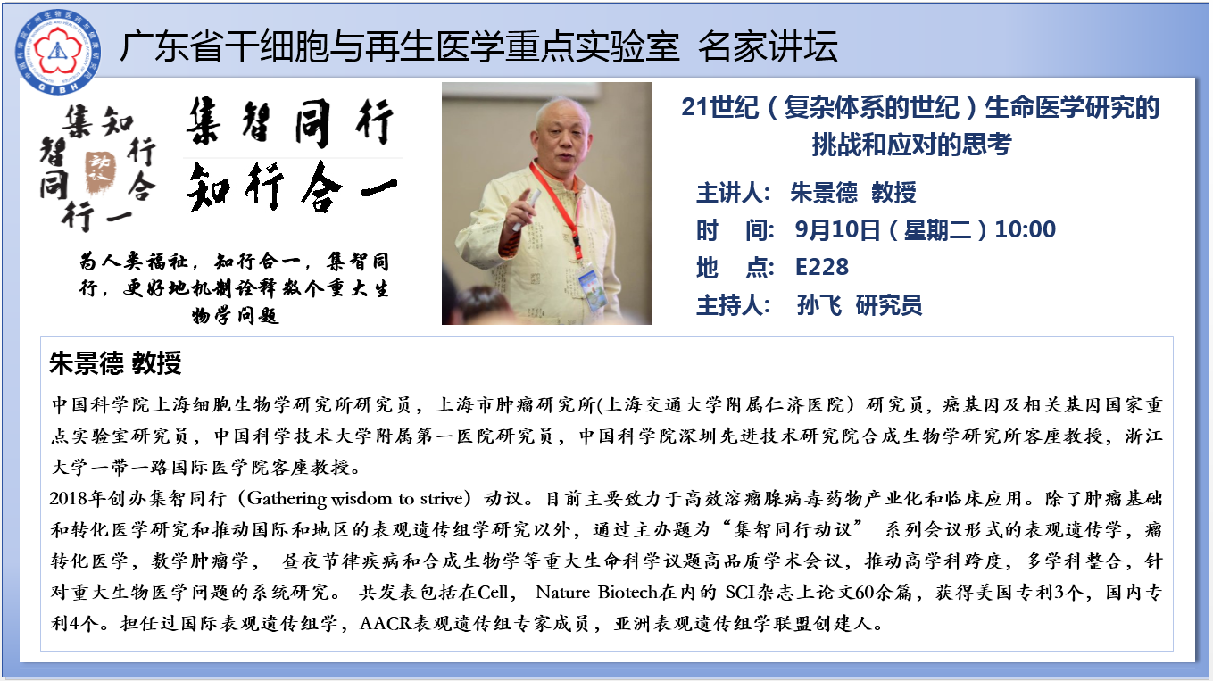 2024年9月10日廣東省干細胞與再生醫學重點實驗室名家講壇:21世紀(復雜體系的世紀)生命醫學研究的挑戰和應對的思考